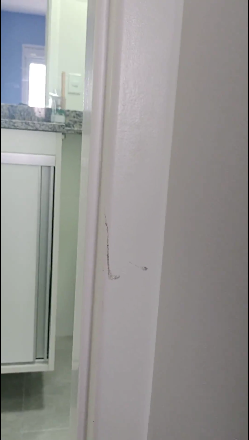 | Parede suja na entrada do banheiro social | Parede marcada de sujeira na entrada do banheiro social | |