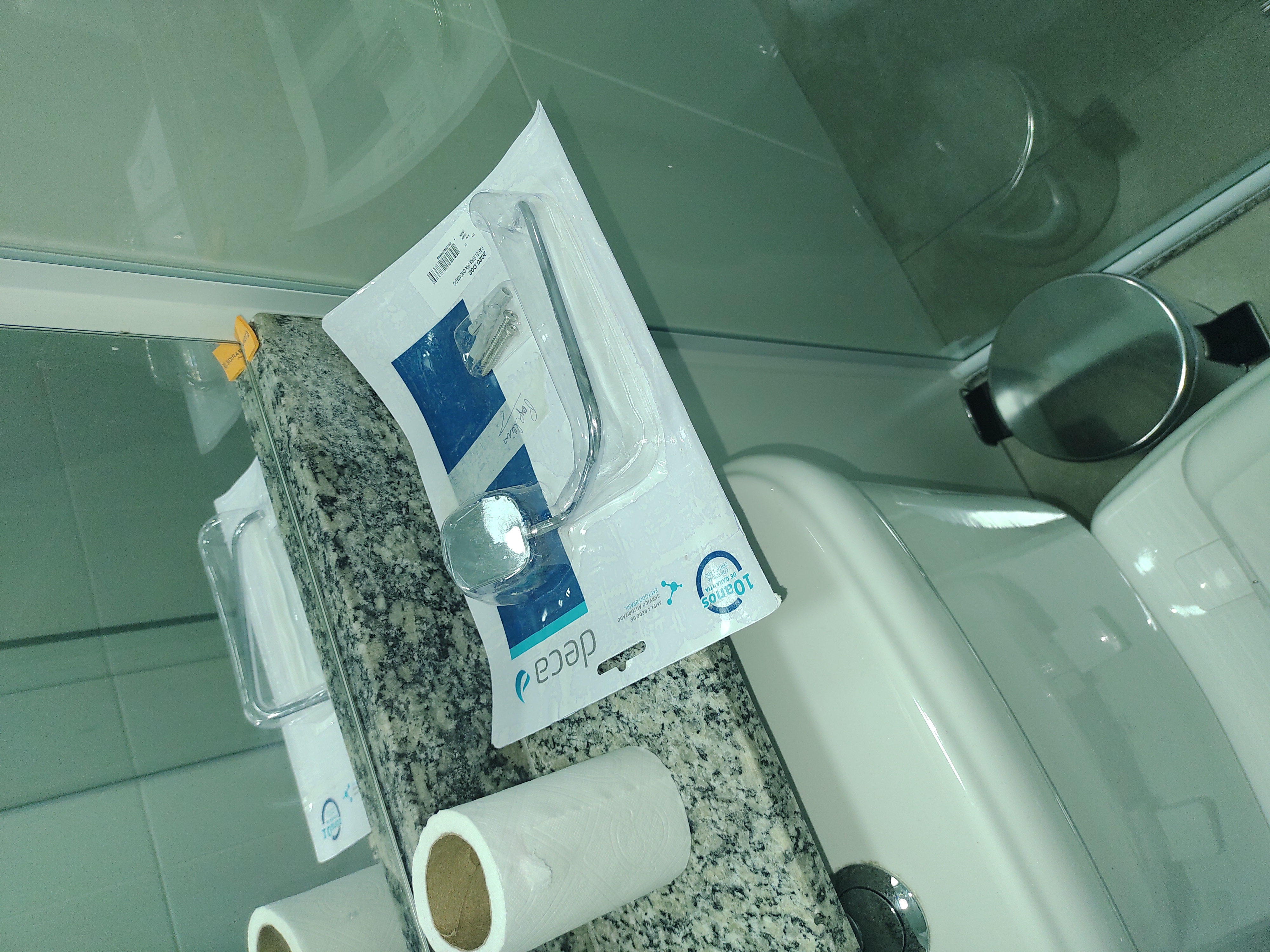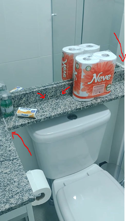 | Mão francesa inexistente | Quando perguntado à arquiteta, foi dito por ela que essa parte superior ao botão do vaso sanitário era móvel, soltando parafusos, seria uma mão francesa, permitindo facilidade de inserção das mãos para possível manutenção dentro da louça do vaso, contudo ela está chumbada, fixa, impossível de remover. Está assim tanto no banheiro social quanto no da suíte |