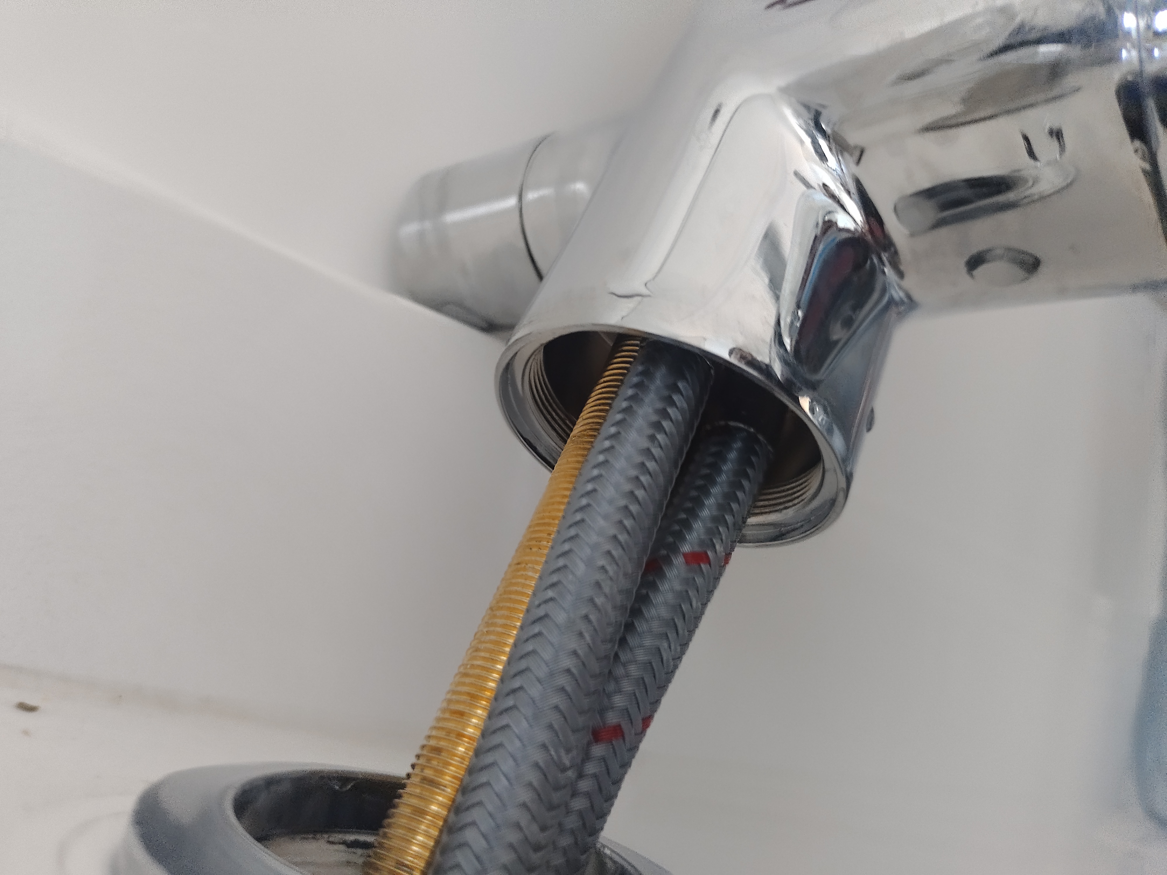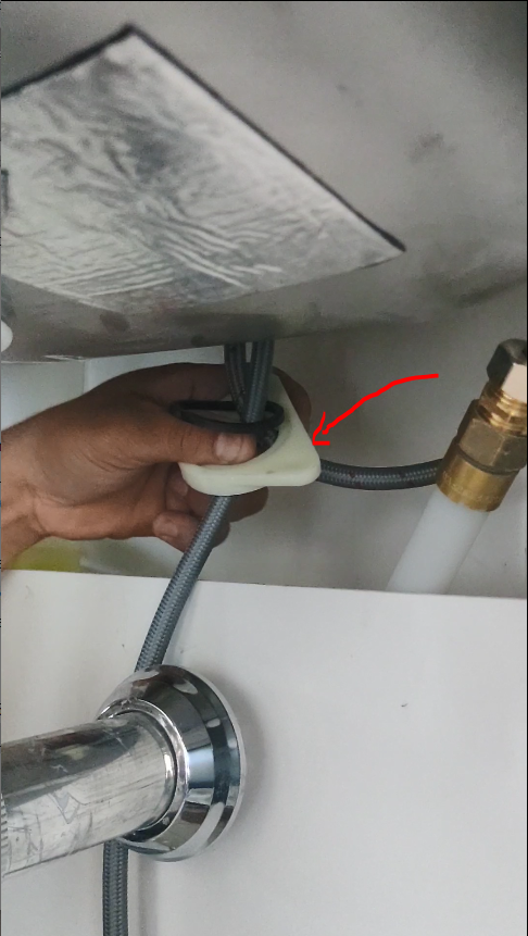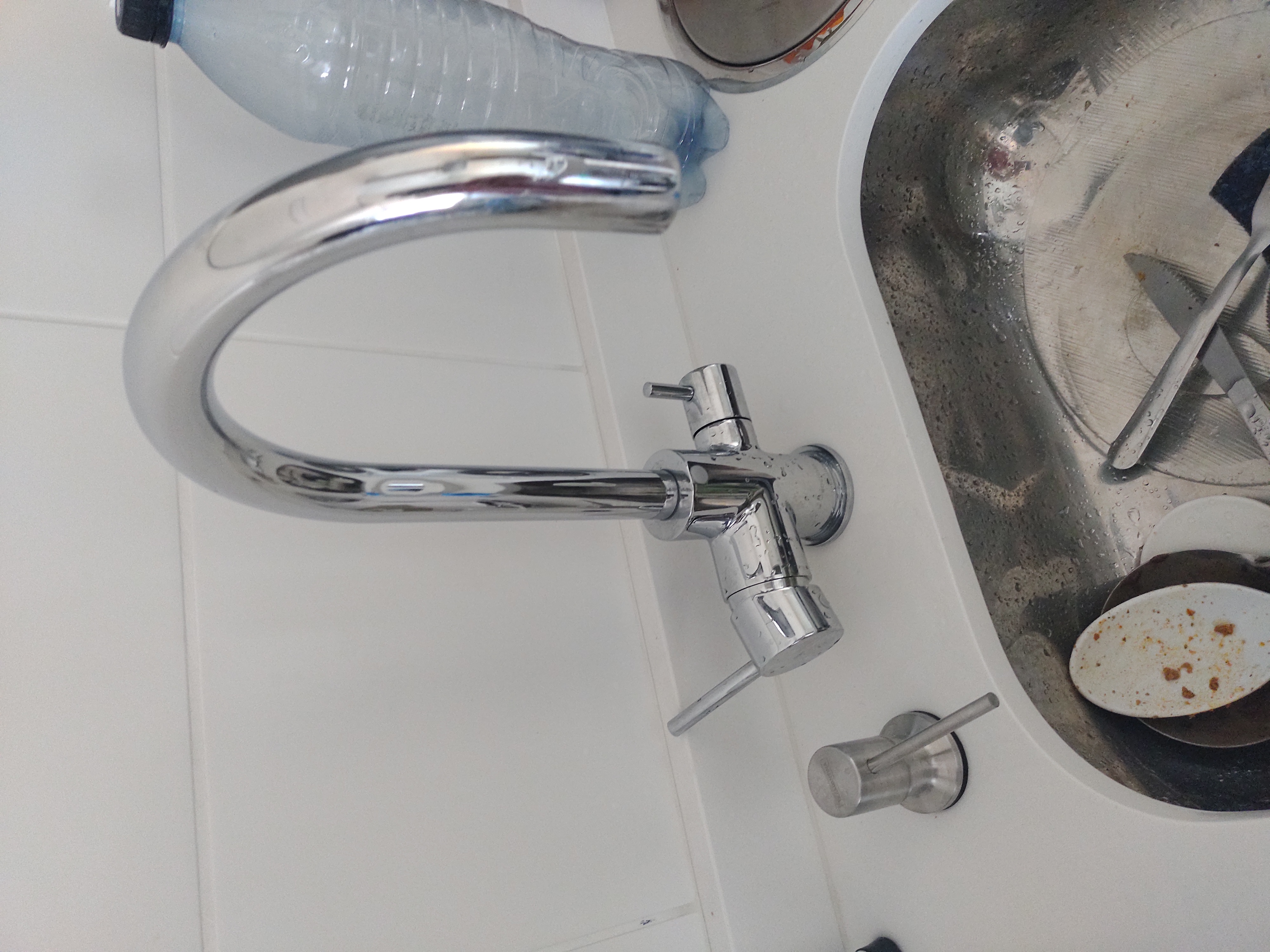 Está faltando também uma peça de fixação da torneira, por isso ela estava frouxa na pia |