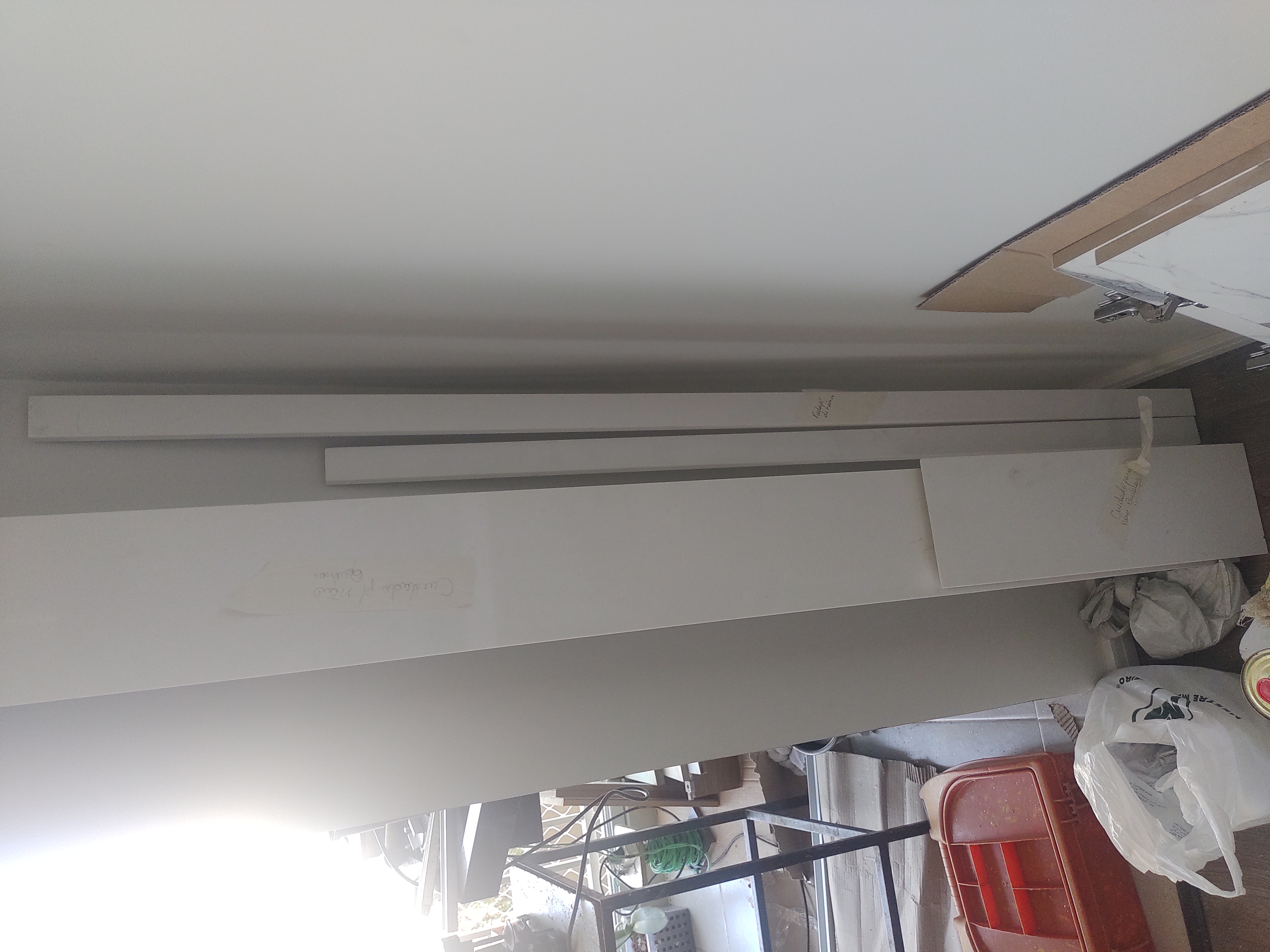 Essas peças de mármore estão sem uso, tem peça que foi medida errada por não considerar a presença da máquina de lavar louça, e mesmo cortando vai sobrar peça. Tem peça ausente e outras as quais não se sabe por que existem, ficam sobrando. |