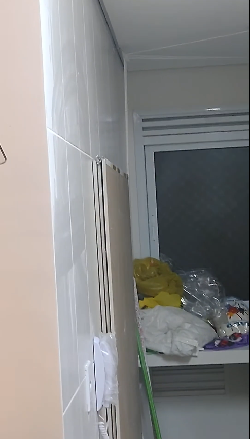 Parede imunda da cozinha para a lavanderia, mais sobra de placas de drywall |
